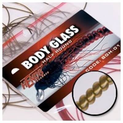 Béžový bodyglass tenký (kulatý), HENDS BGK40, délka 2.5m. Sklovitě kulatá bužírka pro vázání různých druhů larev pakomárů, patentek, ke kroužkování nymf, tvorbu hřbítků malých mušek atd. Je určen především k tvorbě skleněného článkovaného tělíčka. Bodyglass je dodáván v originálním balení. Částečná průhlednost materiálu umožňuje podkladem stanovit světelnost.