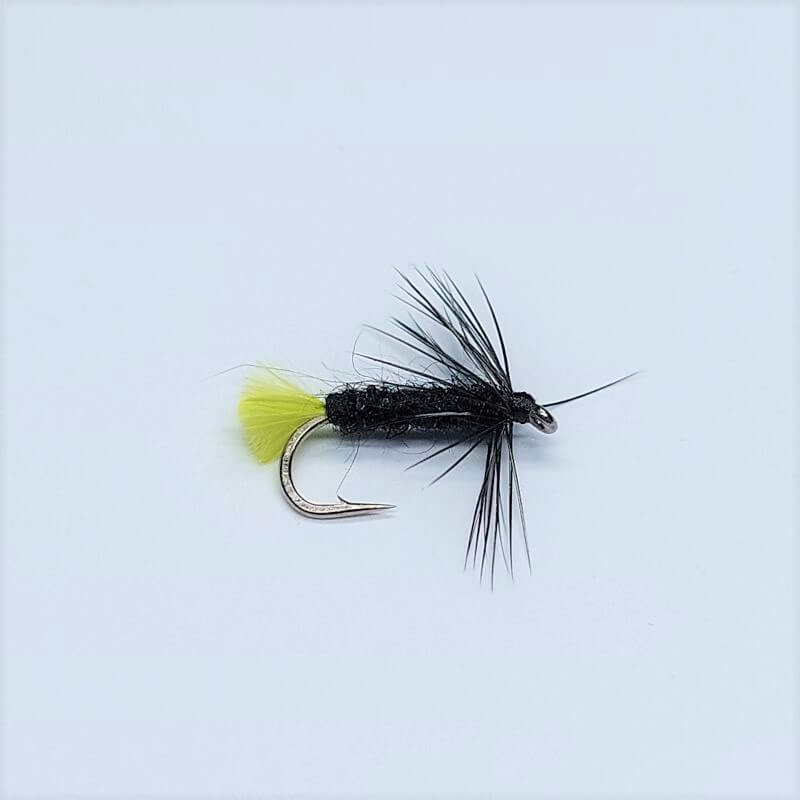 Mokrá muška z černého dubbingu se světle zeleným tipem a černým kohoutem.