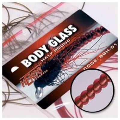 Červenorůžový bodyglass tenký (klasický), HENDS BGK241, délka 2.5m. Sklovitě kulatá bužírka pro vázání různých druhů larev pakomárů, patentek, ke kroužkování nymf, tvorbu hřbítků malých mušek atd. Je určen především k tvorbě skleněného článkovaného tělíčka. Bodyglass je dodáván v originálním balení. Částečná průhlednost materiálu umožňuje podkladem stanovit světelnost.
