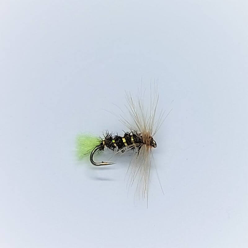 Mokrá moucha se zelenožlutým tipem(ocáskem) na protihrotém háčku.
