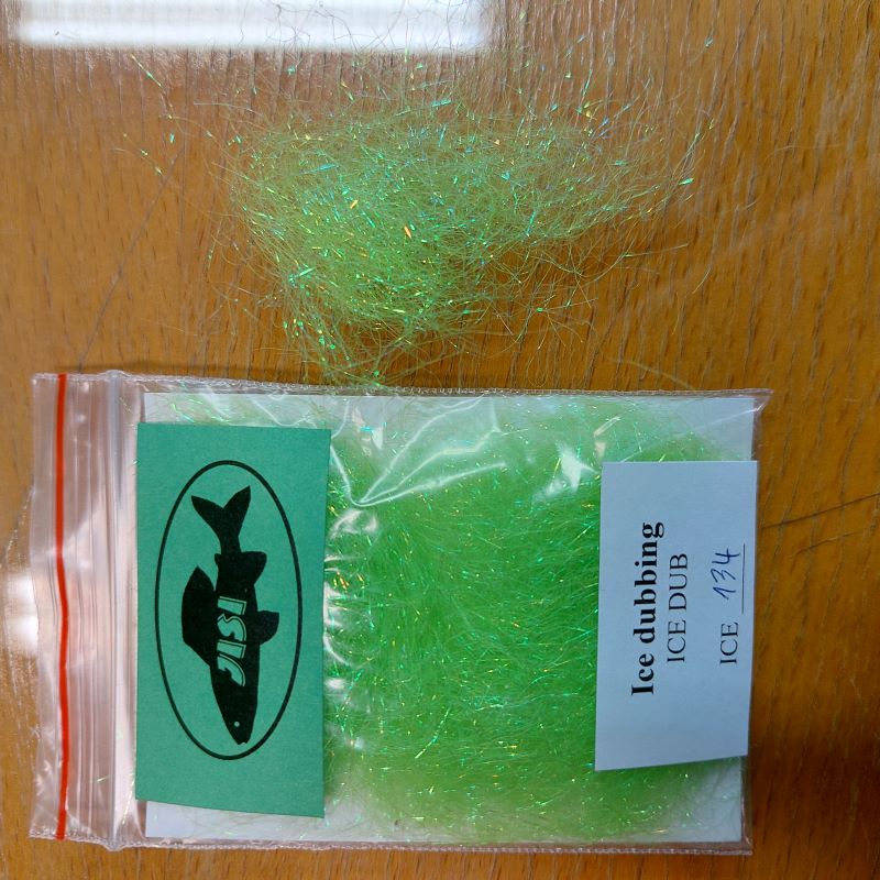 Fluo zelený(Fluo Lime Green) ICE DUB (flashabou, angelhair, SPECTRA DUBBING), JISI, ICE134, balený v sáčku 6x8 cm. Umělý efektní materiál (vysoký spektrální lesk) neocenitelný při vázání některých typu uměxfhlých mušek (určitě na něj narazíte při své tvorbě), který rozhodně nelze opominout. Používejte jej na dubbování tělíček mušek, zvýraznění částí mušek apod. Dubbingy je možné míchat za účelem získání barvy svého srdce.