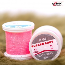 Fluorůžové BUZZER BODY, HENDS B04, 11m. Tělíčkový materiál v podobě ploché lametky vhodný nejen ke zhotovení tělíček některých typů mušek, zvláště larev a kukel pakomárů, ale také k vytváření jejich částí, jako je kroužkování, tipy, střapečky, dýchací orgány pakomárů a další..