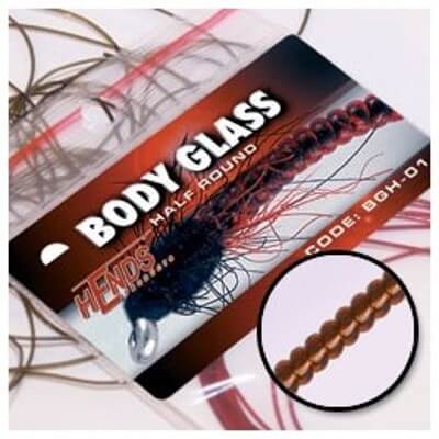 Hnědočervený bodyglass tenký (klasický), HENDS, délka 2.5m. Sklovitě půlkulatá bužírka pro vázání různých druhů larev pakomárů, patentek, ke kroužkování nymf, tvorbu hřbítků malých mušek atd. Je určen především k tvorbě skleněného článkovaného tělíčka. Bodyglass je dodáván v originálním balení. Částečná průhlednost materiálu umožňuje podkladem stanovit světelnost.