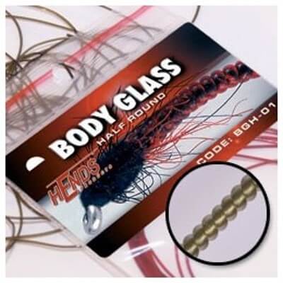Šedý bodyglass tenký (klasický), HENDS, délka 2.5m. Sklovitě půlkulatá bužírka pro vázání různých druhů larev pakomárů, patentek, ke kroužkování nymf, tvorbu hřbítků malých mušek atd. Je určen především k tvorbě skleněného článkovaného tělíčka. Bodyglass je dodáván v originálním balení. Částečná průhlednost materiálu umožňuje podkladem stanovit světelnost.