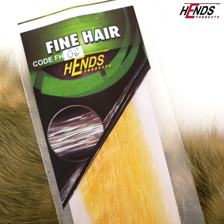 Žluté FINE vlasy, perleťově lesklé, HENDS FH06, balené v sáčku 5x25 cm. Umělý měkký efektní materiál (perleťový lesk) neocenitelný při vázání některých typů umělých mušek (určitě na něj narazíte při své tvorbě). Používejte jej na ocásky streamerů, křídla streamerů, apod. Jeho měkkost zaručuje vynikající pohyb ve vodě.