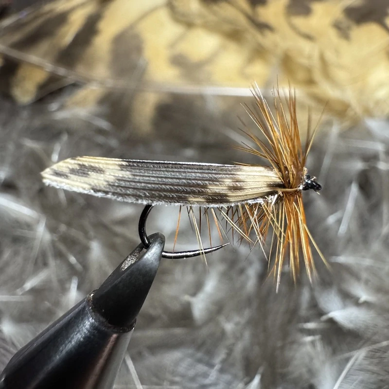 - Použitý materiál: Hnědý antron dubbing, rezavé nožičky z kohouta, bažantí slepice