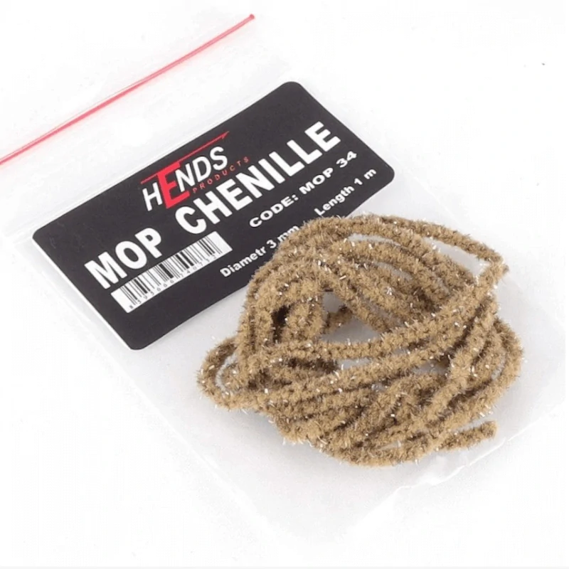 Mop Chenille (HENDS) o průměru 3 mm a délce 1 metru je oblíbený materiál pro vázání tělíček nymf a larev chrostíků, suchých chrostíků, pošvatek i dalších typů mušek. Díky své specifické struktuře působí velmi přirozeně a zvyšuje účinnost mušek.