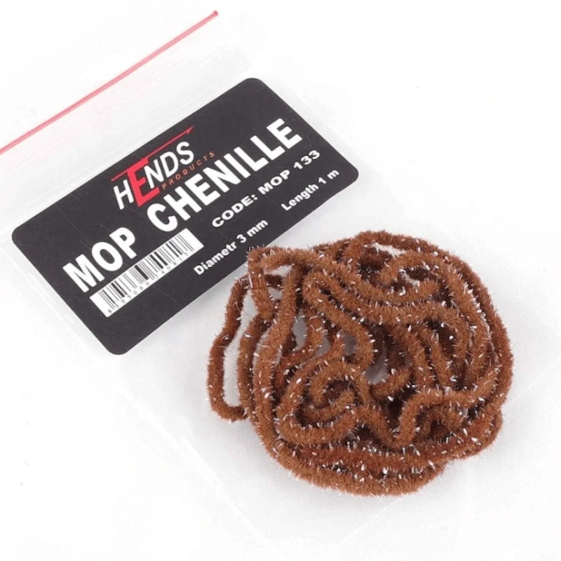 Mop Chenille (HENDS) o průměru 3 mm a délce 1 metru je oblíbený materiál pro vázání tělíček nymf a larev chrostíků, suchých chrostíků, pošvatek i dalších typů mušek. Díky své specifické struktuře působí velmi přirozeně a zvyšuje účinnost mušek.