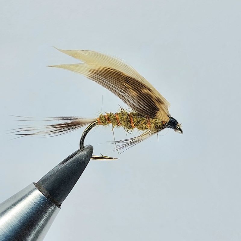 Napodobenina jepice, která neplave na hladině. Chytá se takzvaně na mokrý styl se suchou šňůrou po vodě. Muška se pohybuje kousek pod hladinou. Muška má štety z grizzlyho, je z olivového dubbingu, oranžové lanetky s křídlem.