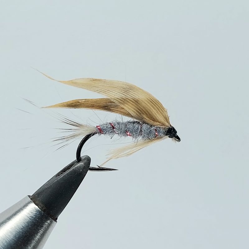 Napodobenina jepice, která neplave na hladině. Chytá se takzvaně na mokrý styl se suchou šňůrou po vodě. Muška se pohybuje kousek pod hladinou. Muška má štety z grizzlyho, je z šedého dubbingu, červené lanetky s křídlem.